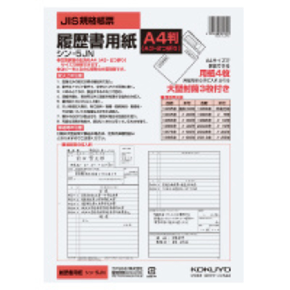 履歴書用紙(大型封筒付き) A4 4枚 シン-5JN コクヨ